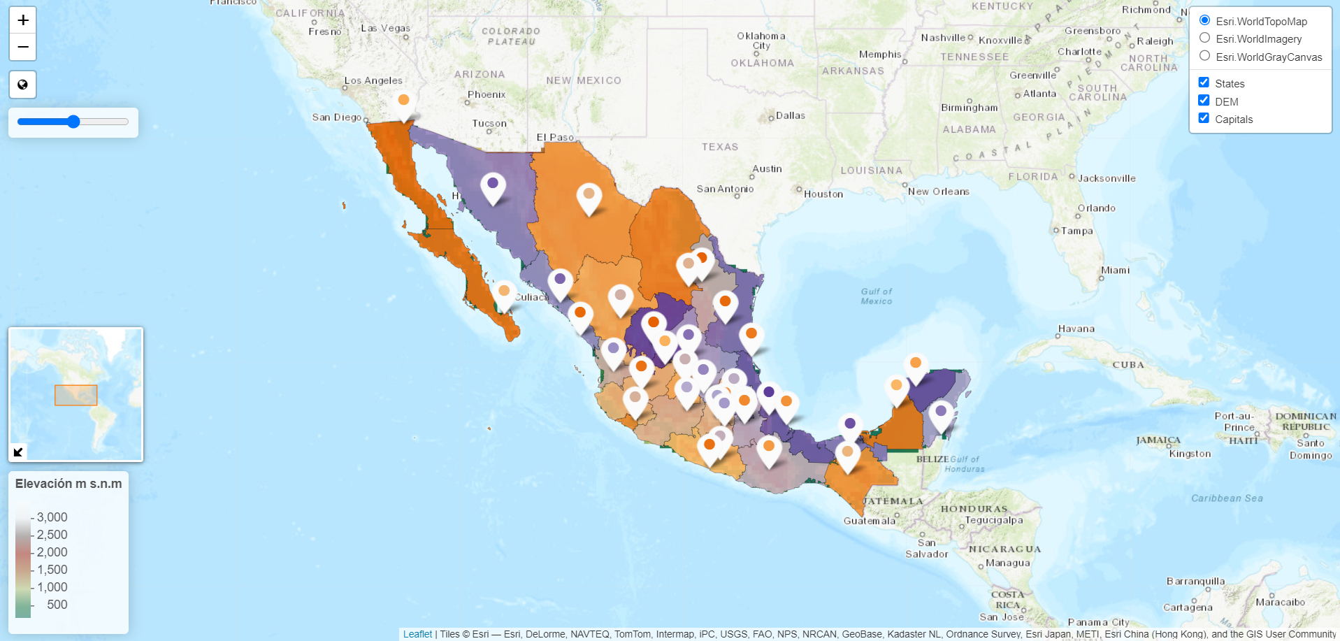 Here I am reading three different datasets, a polygon (mx_states) and a point (caps) layer, as well as a raster (DEM).