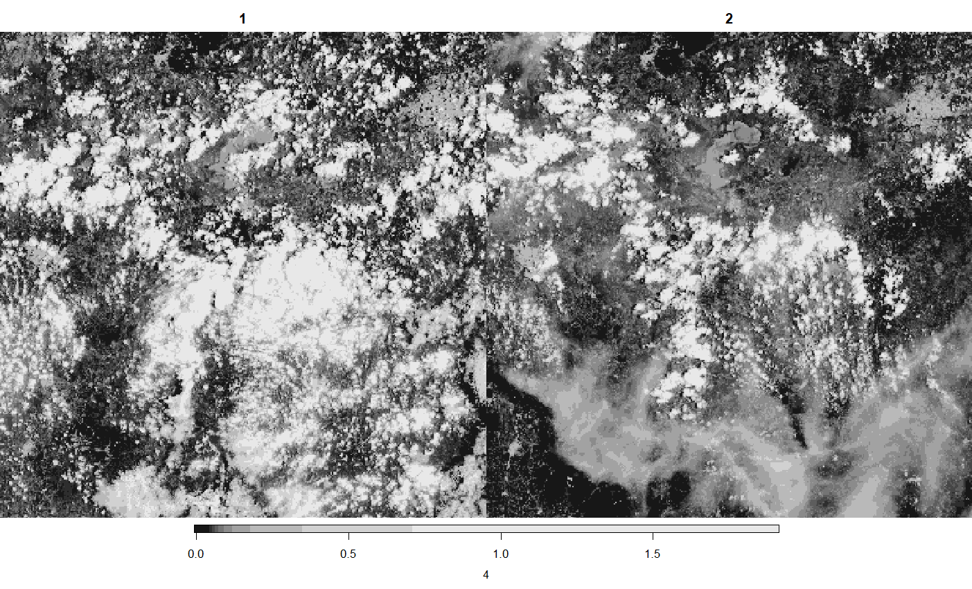 output_dir = folder)Let’s check the files. We’ll need a loop to stack the two bands for a single date and then create a spatiotemporal object, setting the date as the time dimension. This checking can be done using terra or stars packages. Here we used stars.