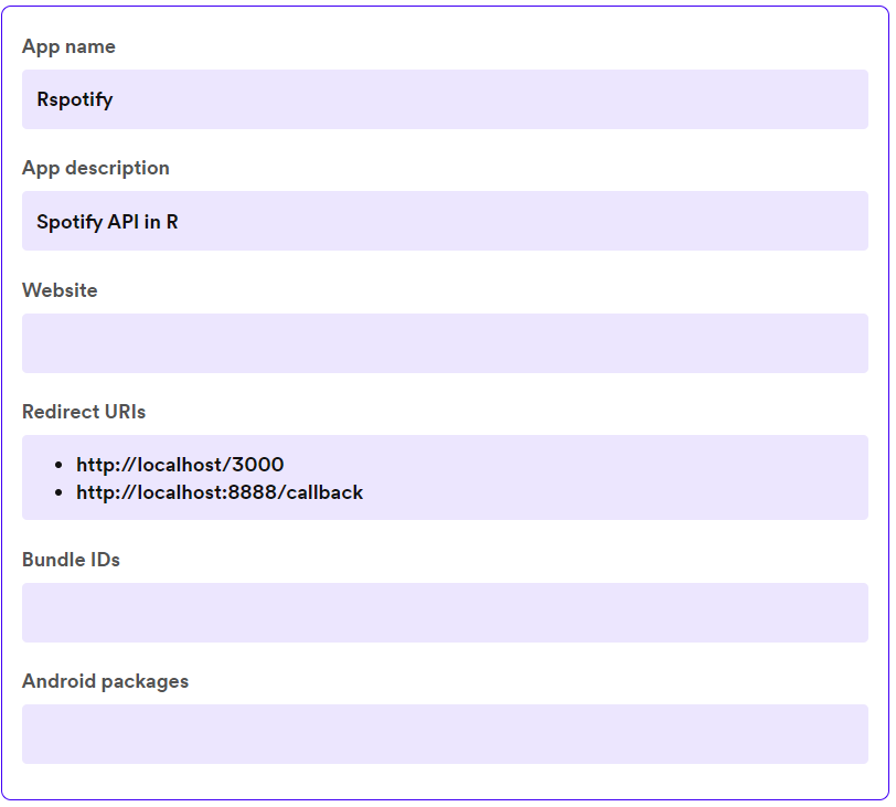 The first step is registering in the Spotify Developer App: https://developer.spotify.com/. Once you are registered, you should create a new app. In that new window you only need to give the app a name, and app description and set some redirect URIs. All the other entries you can leave them empty. For example: