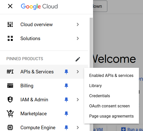 Once created, open the project (using the same tab as previous step) and click on the three lines left of the Google Cloud logo, go to APIs & Services and Enabled APIs & services.